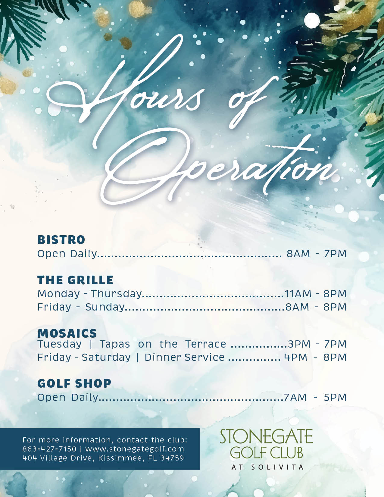 The main dining venue at Stonegate Golf Club is The Grille. It offers a casual dining experience with top-rated service amidst a sports bar setting. Guests may take advantage of the option to relax and enjoy outdoor seating after their day of golfing.